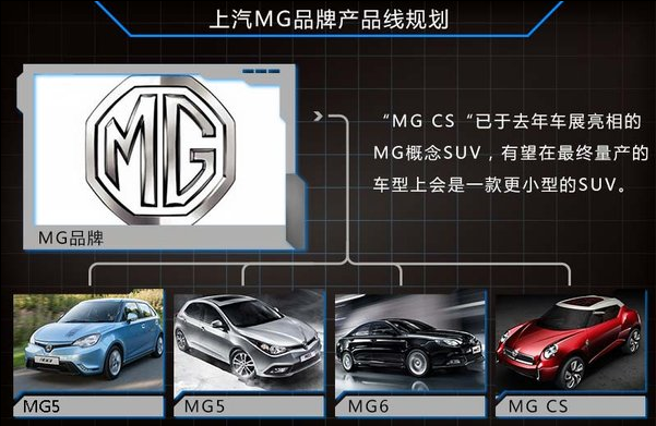 上汽旗下榮威與MG兩大品牌目前采用了分網營銷的新方式,而MG品牌目前推出的僅有3款轎車,分別為MG3、 MG5以及MG6三款車型。另外,此前上汽官方曾宣布將在明年四季度推出首款小型SUV車型,并有望于明年正式量產,也就是去年車展亮相的MG概念SUV,并有望在最終量產的車型上會是一款更小型的SUV。