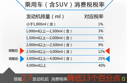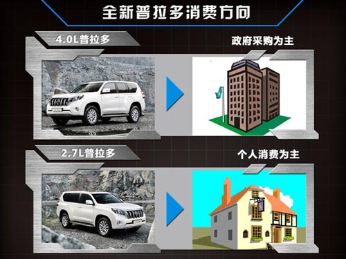 現(xiàn)款4.0升排量的普拉多售價(jià)為53.8萬元,國內(nèi)政府采購其主要消費(fèi)方向,但是隨著政府采購政策收緊和國內(nèi)SUV市場升溫,4.0升排量由于售價(jià)較高影響了其在華銷量,推出2.7升車型后國內(nèi)乘用車消費(fèi)稅將降低十三個(gè)百分點(diǎn),售價(jià)也將大幅下調(diào)。