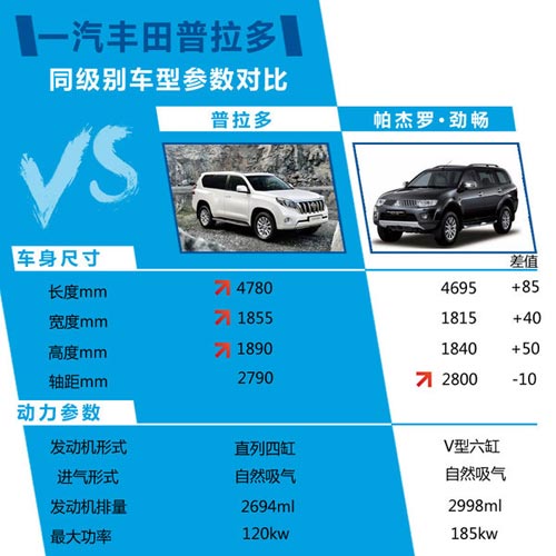 在國產(chǎn)中大型7座SUV中僅有帕杰羅·勁暢和普拉多等車型,前者搭載2.4升和3.0升兩款排量較小的發(fā)動機(jī)。普拉多在車身尺寸上分別為4780mm/1855mm/1890mm,軸距為2790mm,相比競爭對手帕杰羅·勁暢具有明顯優(yōu)勢。但是普拉多2.7升排量則被進(jìn)口車型占據(jù),但是進(jìn)口車型售價(jià)較高,而國產(chǎn)后新車價(jià)格將大幅降低。