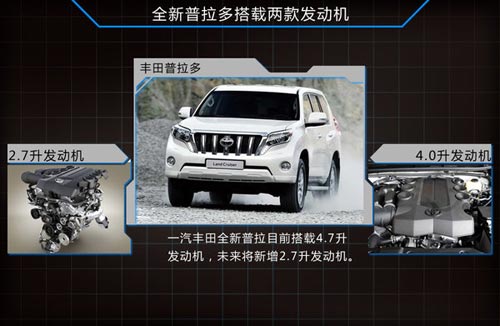 豐田普拉多于2003年正式在國內(nèi)生產(chǎn),此后分別在2005年和2009年進(jìn)行了兩次改款,按日系車型的換代周期來看,現(xiàn)款普拉多即將走進(jìn)生命周期的末端。目前國產(chǎn)只有一款4.0升發(fā)動機(jī)供消費(fèi)者選擇,而國內(nèi)SUV市場中,各大廠商紛紛推出小排量車型,而在海外普拉多即推出2.7升車型,未來新車國產(chǎn)后就將搭載此款發(fā)動機(jī)。