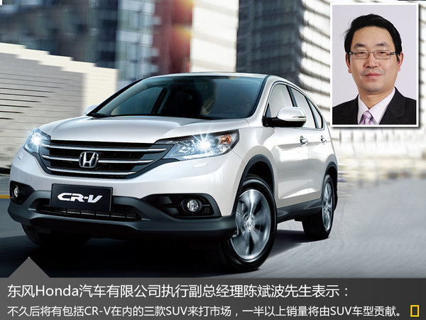 2012年中國SUV市場共計售出183.7萬輛新車,同比增長22.7%,增幅明顯高于狹義乘用車。根據SUV較快的增長幅度,東風Honda正計劃逐漸豐富旗下SUV陣容,對此陳斌波曾表示,未來東風Honda的產品會更加強化個性,同時SUV戰略將成為東風本田的產品戰略。