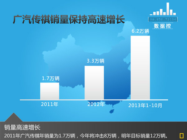 從2010年第一款車下線,三年來廣汽傳祺的銷量保持高速增長。2011年廣汽傳祺銷量僅為1.7萬輛,2012年達到3.3萬輛,今年前十月已銷售6.2萬輛,向8萬輛年銷售目標發起沖擊。根據傳祺規劃,明年目標銷量12萬輛,2020年要達到100萬輛。
