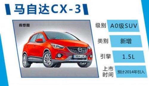 全新的A0級SUV預計將在2014年推出,與此同時馬自達為了增加旗下SUV產品的在華銷量,新車國產后有望落戶長安馬自達。另外,根據馬自達SUV車型的命名規則,這款新增的小型SUV或將被命名為CX-3。