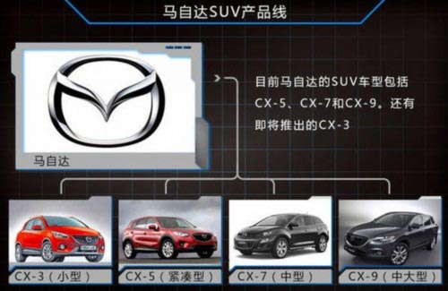 新車將會和馬自達CX-5、下一代馬自達2采用相同的平臺打造,從而獲得優秀的動力和更輕量化的車身。目前馬自達在華投放的SUV車型包括CX-5、CX-7(報價 圖片 參數)和CX-9三款車型,而在小型SUV方面還有產品上的空缺,因此該車的推出將會進一步完善馬自達的產品布局。