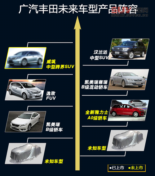 目前廣汽豐田的國產(chǎn)車型陣容已擁有包括雅力士、凱美瑞、凱美瑞尊瑞(混動車型)、逸致以及漢蘭達等5款產(chǎn)品。隨著未來定位于跨界SUV的威颯在華投產(chǎn)后,使該車型也將加入廣汽豐田旗下的國產(chǎn)陣營。