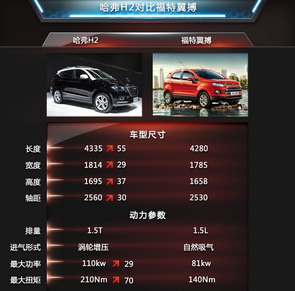 哈弗H2上市后的競爭對手鎖定福特旗下的小型SUV車型翼搏。車身尺寸方面,哈弗H2的長寬高分別為4335mm*1814mm*1695mm,軸距為2560mm,各項均較大幅度的超出福特翼搏的數(shù)據(jù)。和翼搏所搭載的1.5L自然吸氣發(fā)動機相比,哈弗H2的這款排量同為1.5L的渦輪增壓發(fā)動機所提供的最大輸出功率和最大扭矩數(shù)值明顯更高。