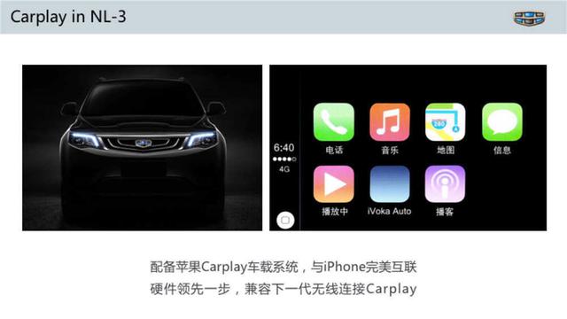 車輛內(nèi)部,吉利博越配備有多功能方向盤、中控臺觸摸屏、雙溫區(qū)自動空調(diào)、定速巡航、一鍵啟動系統(tǒng)等配置,而且從圖片上可以看出,整個內(nèi)飾的設(shè)計也是相當時尚的。同時新車還采用了吉利全新一代車載信息互聯(lián)系統(tǒng),并且兼容由蘋果公司開發(fā)的CarPlay,此系統(tǒng)可以完美的兼容蘋果手機,并且用戶可以通過中控大屏來操作手機中的相關(guān)APP,如撥打電話、發(fā)送短信、播放音樂、蘋果地圖導航等等。
