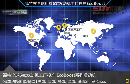 福特全球共有6家發動機基地分別投產EcoBoost系列發動機,其中位于美國俄亥俄州克利夫蘭工廠將用以生產V6 EcoBoost發動機,位于英國布里真德工廠和西班牙巴倫西亞工廠則投產1.6L和2.0L EcoBoost發動機,1.0L和1.5L EcoBoost發動機在德國福特科隆工廠和羅馬尼亞克拉約瓦工廠打造,目前位于中國重慶的長安福特第一發動機廠便生產2.0L EcoBoost發動機。