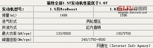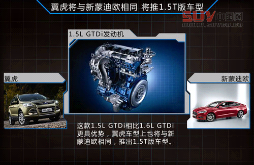 目前翼虎車型上所搭載的1.6L GTDi與即將上市的新蒙迪歐所搭載的1.5L GTDi相比,動力性能略遜于后者,1.5L GTDi還因低排量的因素,令其在消費稅上相比1.6L GTDi要降低2%,節省近2,000元稅費,這也使得這款發動機更加適合中國市場。此外由于兩款車型目前的動力系統均是匹配的6速手自一體變速箱。