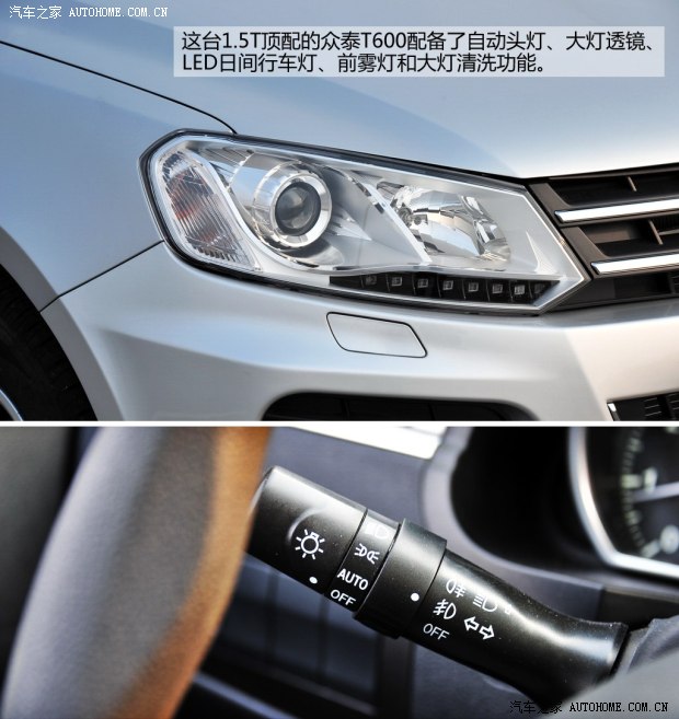 從功能性上來看,這臺1.5T頂配的眾泰T600配備了自動頭燈、大燈透鏡、LED日間行車燈、前霧燈和大燈清洗功能,看起來還是很豐富的,而在低配車型上,首先最有可能被去除的就是霧燈。
