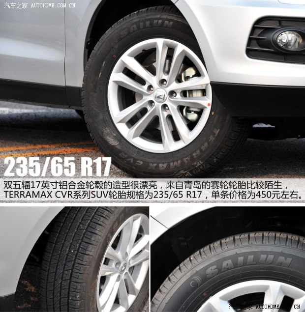 雙五輻17英寸鋁合金輪轂的造型很漂亮,來自青島的賽輪輪胎就比較陌生了,TERRAMAX CVR系列SUV輪胎規(guī)格為235/65 R17,據(jù)說是一款性價比很出色并且很耐磨的產(chǎn)品,簡單查詢了一下,單條輪胎的價格大概在450元左右。不過在此之前我還真想不起來有哪款車使用了這個品牌的輪胎。