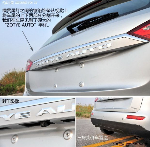 橫貫尾燈之間的鍍鉻飾條從視覺上將車尾的上下兩部分分割開來,并且很好的平衡了車尾的視覺比例。或許是因?yàn)楸娞┢嚨姆叫蜭OGO實(shí)在難以在車尾安家,所以我們在車尾見到了碩大的“ZOTYE AUTO”字樣。