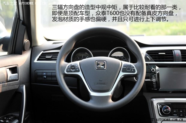 三輻方向盤的造型中規(guī)中矩,屬于比較耐看的那一類。即便是頂配車型,眾泰T600也沒有配備真皮方向盤,發(fā)泡材質(zhì)的手感也偏硬,希望量產(chǎn)之后能夠有所改善。方向盤配備了多功能按鍵,可以用來控制音響系統(tǒng)和車載藍(lán)牙電話等功能。