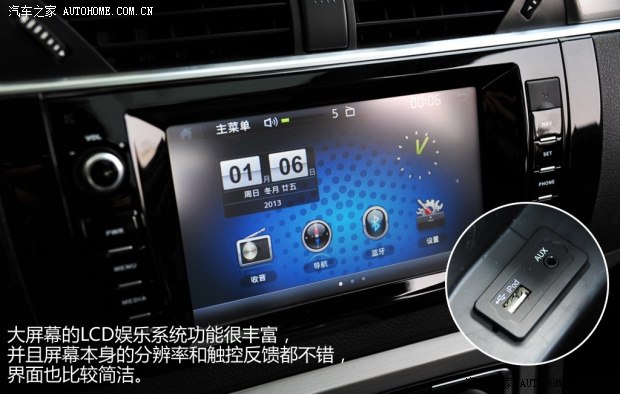 大屏幕的LCD娛樂系統(tǒng)功能很豐富,并且屏幕本身的分辨率和觸控反饋都不錯,界面也比較簡潔。包括導(dǎo)航、藍(lán)牙電話、倒車影像以及AUX和USB播放等功能一應(yīng)俱全,考慮到試裝車的關(guān)系,其中的部分功能我們尚未能夠進(jìn)行體驗(yàn)。