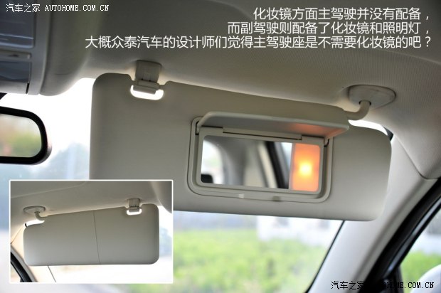 化妝鏡方面主駕駛并沒有配備,而副駕駛則配備了化妝鏡和照明燈,大概眾泰汽車的設(shè)計(jì)師們覺得主駕駛座是不需要化妝鏡的吧?