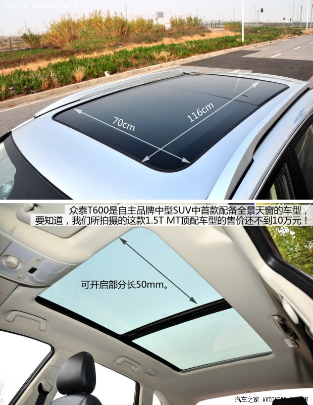 面積超大的全景天窗是眾泰T600的最大亮點(diǎn)之一,印象中國內(nèi)自主品牌SUV產(chǎn)品中鮮有配備全景天窗的車型。而經(jīng)過實(shí)測,T600的全景天窗面積接近0.81平方米,而可開啟部分也占到了整個天窗的1/2。