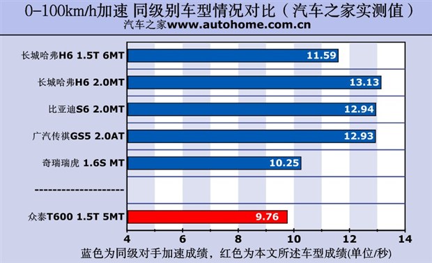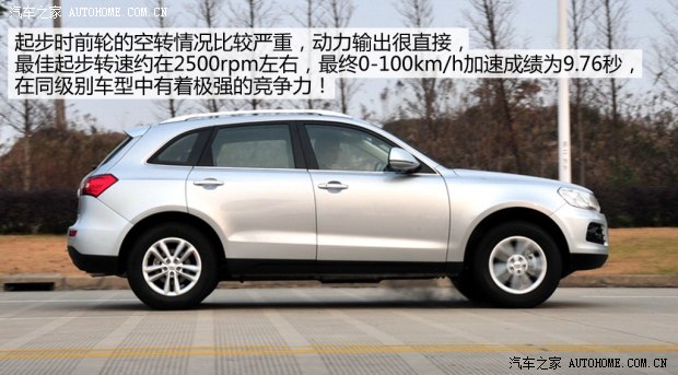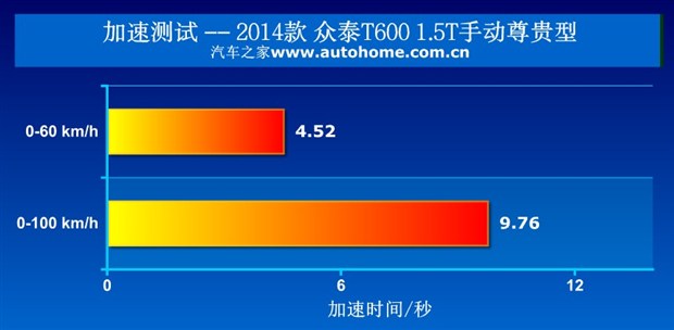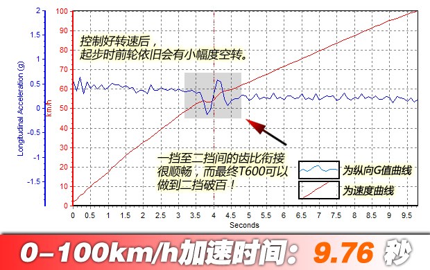 在進(jìn)行性能測試時,眾泰T600的表現(xiàn)讓人相當(dāng)驚嘆,最佳起步轉(zhuǎn)速約在2500rpm左右,若是轉(zhuǎn)速過高則前輪會出現(xiàn)長時間的空轉(zhuǎn),過低則導(dǎo)致轉(zhuǎn)速的迅速下降,從而影響成績。經(jīng)過多次的實(shí)測,T600 1.5T手動擋車型可以在2擋末端剛好達(dá)到時速100km/h,而最終的0-100km/h加速成績?yōu)?.76秒,和同級別對手相比表現(xiàn)相當(dāng)有競爭力,而若是換上一套性能更佳的輪胎,我們猜測其加速表現(xiàn)還能有進(jìn)一步的提升。