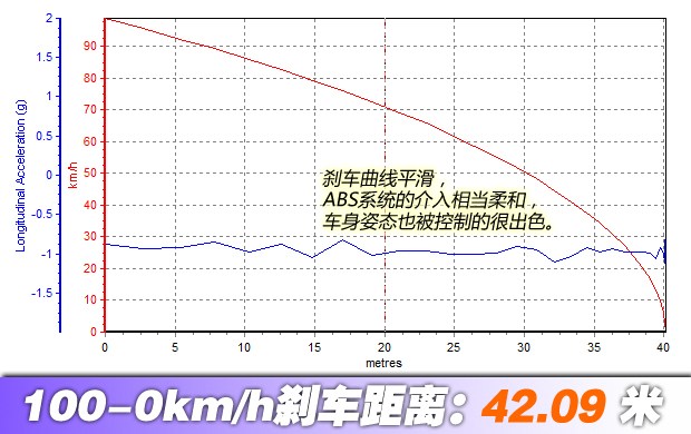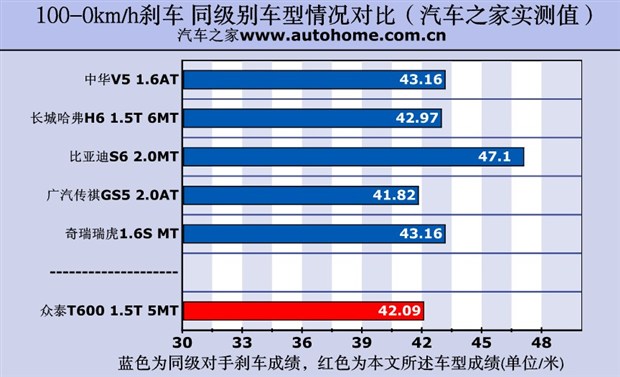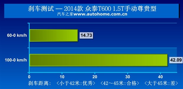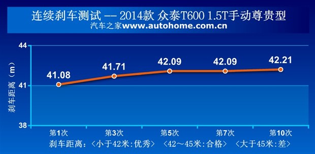 而在剎車表現(xiàn)上,偏硬的前懸架牢牢的抑制住了車身的前傾,使之被控制在一個相當(dāng)好的范圍之內(nèi),而實(shí)際制動力表現(xiàn)卻一點(diǎn)不差。多次測試下來,眾泰T600的剎車系統(tǒng)很可靠,多次全力剎車后熱衰減效應(yīng)并不明顯,最終的100-0km/h剎車距離定在42.09米,同樣在和競爭對手的對抗中表現(xiàn)搶眼。