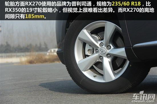 輪胎方面RX270使用的品牌為普利司通,規格為235/60 R18,比RX350的19寸輪轂略小,但視覺上很難看出差異。另外,RX270的離地間隙只有185mm,也反映出它還是更偏向于城市公路性的一款SUV。