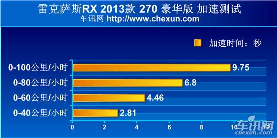 0-100公里/小時加速的過程中,關閉ESP,將轉速控制在3000rpm起步,前置前驅的RX270的輪胎出現了較為明顯的打滑,并且引發打滑的時間有些偏長。而將近2噸的車身重量也能很好的給車頭施加壓力。總體來說,起步姿態還算中規中矩。
