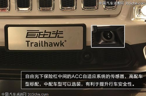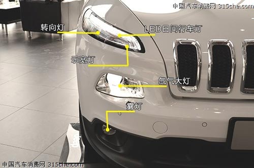 Jeep自由光采用了復雜的分體式大燈設計,全車采用LED照明技術。上部燈組為日間行車燈、轉向燈和示廓燈,中部燈組為遠近一體式大燈,而下部則為霧燈。