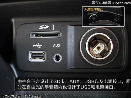 中控臺下方設計了SD卡、AUX、USB以及電源接口,同時在手套箱內還設計了USB和電源接口,手機充電和多媒體文件傳輸非常方便。另外,自由光還設計了專門充電的手機套,可以適用不同的手機,這樣就不怕繁亂的數據和充電線。