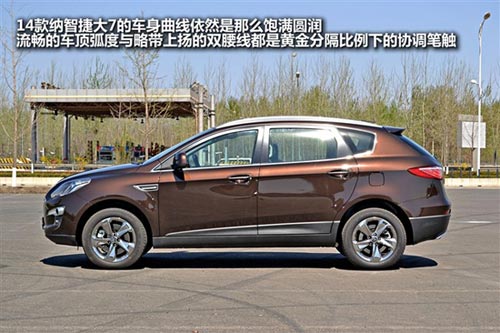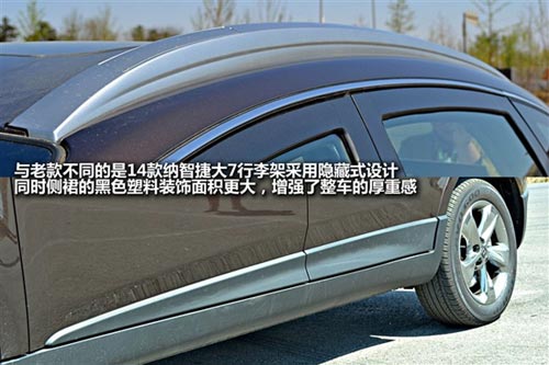 14款納智捷大7的車身曲線依然是那么飽滿圓潤,流暢的車頂弧度與略帶上揚的雙腰線都是黃金分隔比例下的協調筆觸。與老款不同的是14款納智捷大7行李架采用隱藏式設計,同時側裙的黑色塑料裝飾面積更大,增強了整車的厚重感。