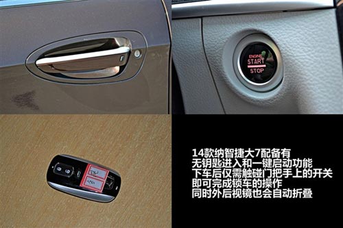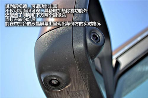 14款納智捷大7配備有無鑰匙進入和一鍵啟動功能,下車后僅需觸碰門把手上的開關,即可完成鎖車的操作,同時外后視鏡也會自動折疊。說到后視鏡,可謂功能豐富,不僅可視面積可觀,具備電加熱除霧功能外,還配備了側向和下方兩個攝像頭。當打開轉向燈后,能在中控臺的液晶屏幕上呈現出車側方的實時路況。