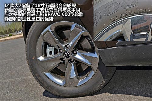 14款大7配備了18寸五輻鋁合金輪轂,新穎的高亮電鍍工藝讓它顯得與眾不同。與之搭配的是瑪吉斯BRAVO 600型輪胎,靜音和舒適性是它的優勢,具體規格為235/55 R18,與厚重的車身搭配看起來很協調。