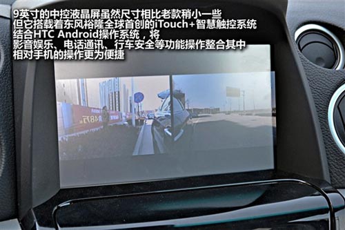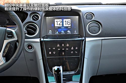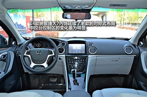 14款納智捷大7內飾延續了老款的對稱式布局,中控臺控制區的變化最為明顯。觸控中央屏幕以及觸控面板有效提升了操作的便利性及整體的科技感。這款9英寸的中控液晶屏雖然尺寸相比老款稍小一些,但它搭載著東風裕隆全球首創的iTouch+智慧觸控系統,結合HTC Android操作系統,將影音娛樂、電話通訊、行車安全等功能操作整合其中,相對手機的操作更為便捷。