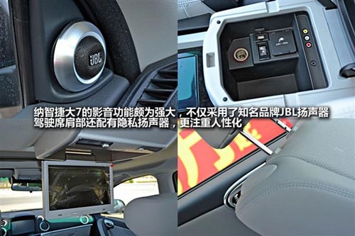 納智捷大7的影音功能頗為強大,不僅采用了知名品牌JBL揚聲器,駕駛席肩部還配有隱私揚聲器,更注重人性化。扶手箱內部三色AV接口、USB、AUX、12V電源一應俱全,后排還提供了大屏液晶顯示器為長途旅行帶來樂趣。