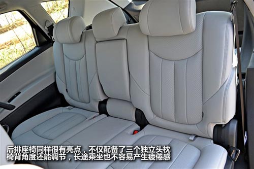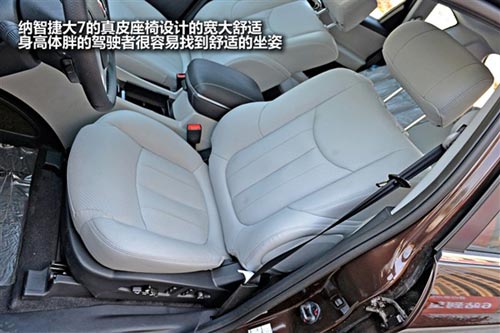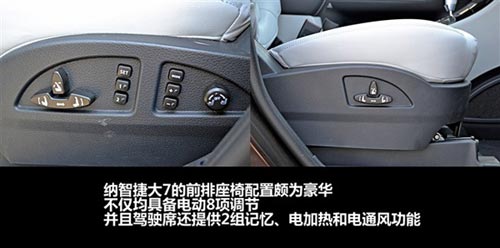 納智捷大7的前排座椅配置頗為豪華,不僅均具備電動8項調節,并且駕駛席還提供2組記憶、電加熱和電通風功能。只是調節按鈕的位置設計不是特別理想,操作起來會帶來一些不便。此外,真皮座椅設計的寬大舒適,身高體胖的駕駛者很容易找到舒適的坐姿。