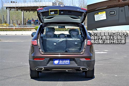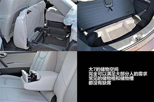 大7的儲物空間完全可以滿足大部分人的需求,常見的儲物格和儲物槽都沒有缺席,后備箱的容積更是可觀。如果把后排座椅放倒后,放入幾輛自行車是完全沒有問題的。