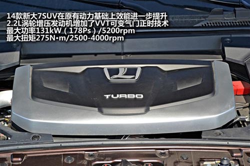動力方面,14款新大7SUV在原有動力基礎上效能進一步提升。2.2L渦輪增壓發動機增加了VVT可變氣門正時技術,最大功率131kW(178Ps)/5200rpm;最大扭矩275N·m/2500-4000rpm。