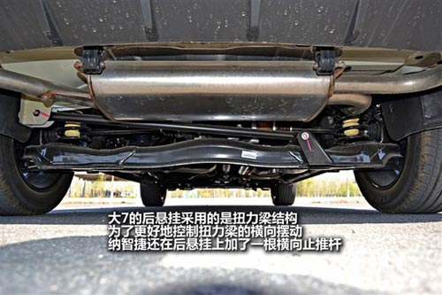 大7的后懸掛采用的是扭力梁結構,為了更好地控制扭力梁的橫向擺動,納智捷還在后懸掛上加了一根橫向止推桿,一頭接橫梁一頭接車身,有利于改善操控穩定性,而且還特意在車身連接點處做加強處理。
