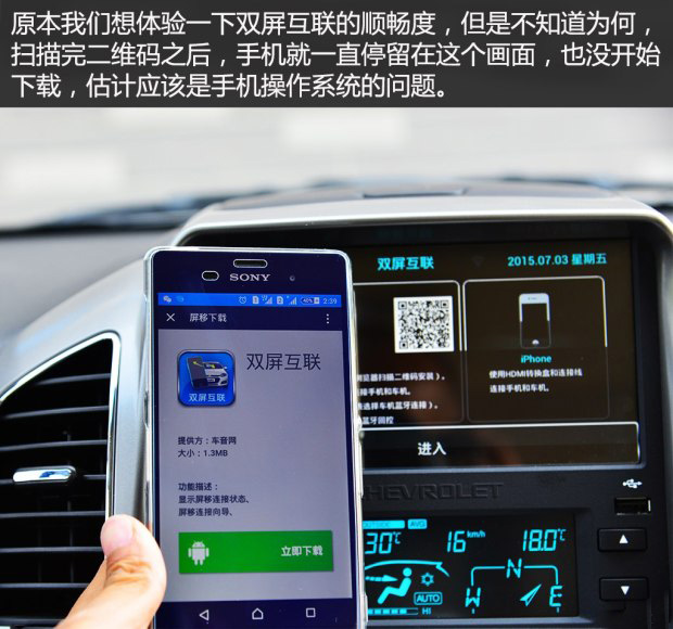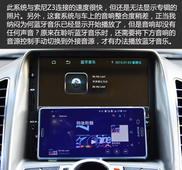 另外,這套多媒體系統雖然可以用藍牙與手機連線,但是當你想要播放手機中的音樂時,卻還需要將音響系統切換至外接音源,才有辦法播放手機中的音樂。很顯然地,這套系統與原本車上的音響系統整合度并不高。照理來說,與藍牙連接之后,應該會自動切換至藍牙音源才是。不過這套系統與索尼Z3手機連接的速度倒是挺快的(使用安卓系統)。至于車上的雙屏互聯功能,可能是因為手機系統的原因,我們當天無法體驗這項功能。