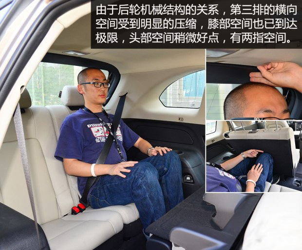 不過第三排座位的表現,就真的令人明顯感受到不足了,由于此車的第二排座椅無法前后移動,所以第三排的空間是完全無法改變的。在我們的體驗過程中,我們1.76米高的體驗者入座之后,膝部空間已經趨近于零了。這樣的表現,讓這輛車的第三排空間真的只能“應急”,因為成人坐在里面會感受到相當程度的壓迫。