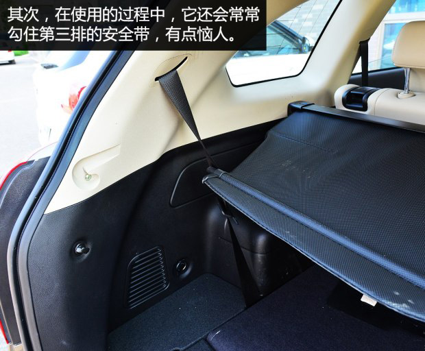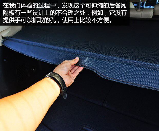 另外,后備廂中的伸縮隔板是很多SUV車上都能見到的配置,但是這個伸縮隔板在第三排需要乘坐乘客時,必須要卸下,這時候你會發現這個隔板會無處收藏。雖然不是什么致命性的錯誤,但是在使用上還是添加了一些不必要的麻煩。