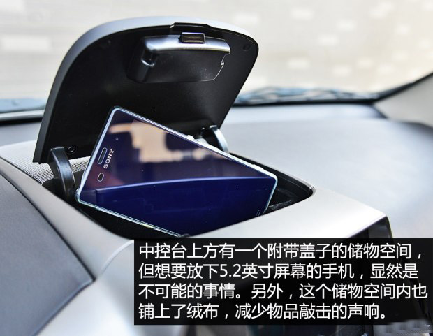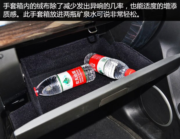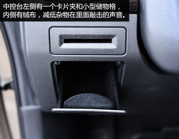 本車的中控臺儲物空間內部都鋪上了絨布,雖然只是一些細節而已,但是給人的感覺就是比起什么都沒有的儲物空間來得好多了,先不論這樣底能夠減少多少物品在儲物格中敲擊的聲響,但是卻能有效提高檔次。