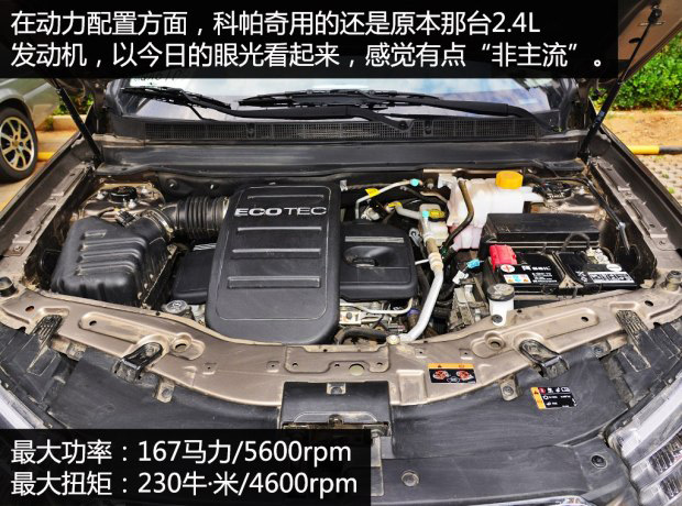 至于動力方面,就是科帕奇與對手相比最不足的地方,正當所有對手幾乎都將渦輪增壓發動機增添到自身的產品陣容時,科帕奇還是以一臺2.4L自然吸氣發動機迎戰所有帶T的對手。就數據上看來,這樣的表現也的確會讓消費者感到一些疑惑,不過這樣的配置還是有些好處,就是降低購車成本,而且,它只需要92號汽油就能夠滿足。