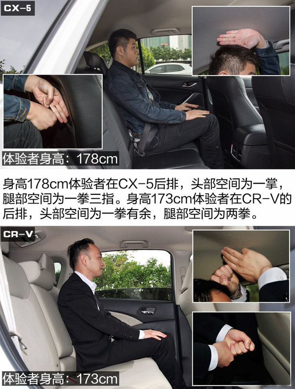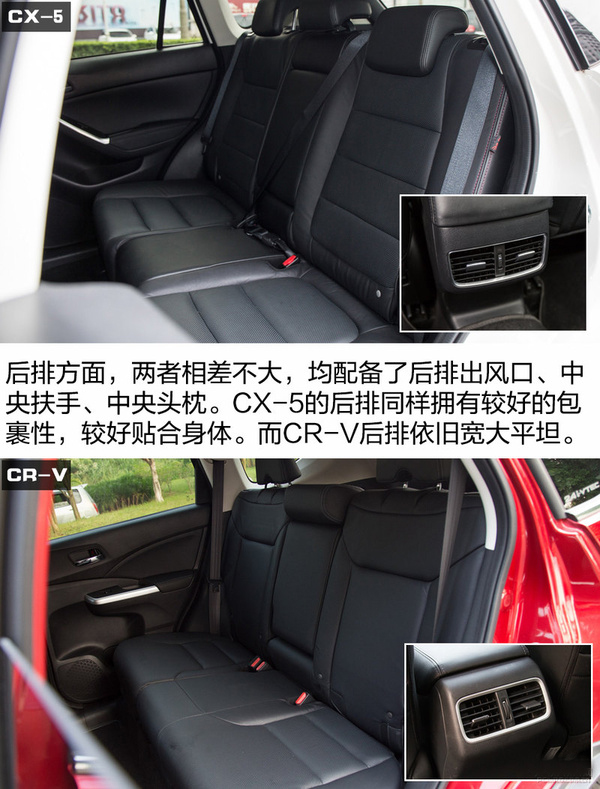 空間放方面,CX-5占有明顯的優勢,得益于外觀尺寸的優勢,CX-5車內乘坐空間得到出色的表現,同時后排座椅支持4/2/4的放倒。而CR-V空間與舊款保持一致,屬同級別車型的中等水平,后排支持4/6比例放倒。