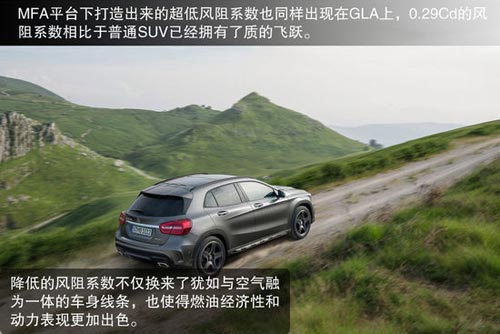 外形區別于A級轎車的不只是GLA略顯龐大的身材,整車外部的黑色防擦條以及向外拓張的輪轂也讓GLA的跨界定位更加明顯。而MFA平臺下打造出來的超低風阻系數也同樣出現在GLA上,0.29Cd的風阻系數相比于普通SUV已經擁有了質的飛躍。降低的風阻系數不僅換來了猶如與空氣融為一體的車身線條,也使得燃油經濟性和動力表現更加出色。