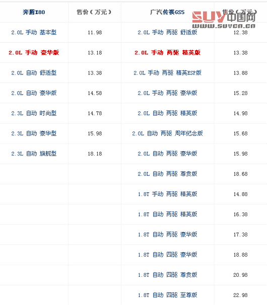 所以經過對比考慮,我們選出了價格接近、配置接近、發動機排量相同、變數箱同為手動擋的奔騰X80 2.0L手動 豪華版和傳祺GS5 2.0L 手動精英版來為您進行對比。