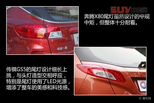 奔騰X80的尾部設計的很有看點,加入了像雙邊雙出的方形排氣管、內陷式獨立后霧燈,以及超寬的后防擦版等設計元素,增添了整車的立體感;傳祺GS5的車尾線條設計的要更為復雜,造型方面也更飽滿,尾燈造型與前車燈造型相互輝映,整體感覺相當的犀利。此外在尾燈光源方面,傳祺GS5的燈內使用了LED光源,無論在視覺感還是在科技感上,都要優于X80那普通光源的尾燈。