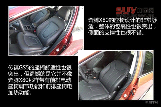 再對比的兩款車型座椅,兩車均采用了真皮座椅,在座椅的舒適性和柔軟性方面,兩車表現的不分伯仲。功能性方面,兩車均有腰部支撐調節,這點顯得特別人性化;在座椅調節功能方面,傳祺GS5為手動調節,而奔騰X80為前排電動調節座椅,并且還帶有前排座椅電加熱功能,這方面奔騰X80占有明顯優勢。