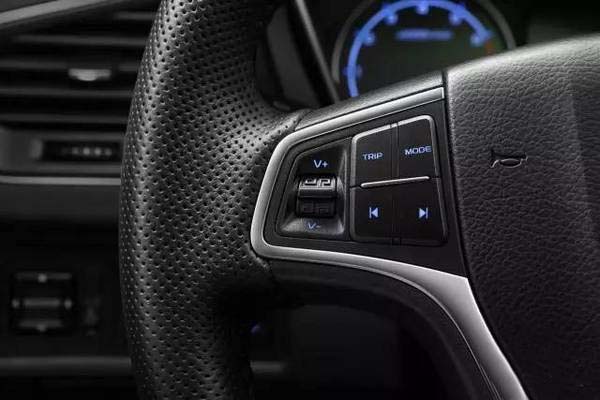 方向盤采用了“博”系列車型的造型風格,三、九點鐘位置的握槽設計,握感舒適。方向盤定速巡航及音量開關采用撥桿式設計,操作便利。儀表臺采用搪塑材料,觸感柔軟舒適。
