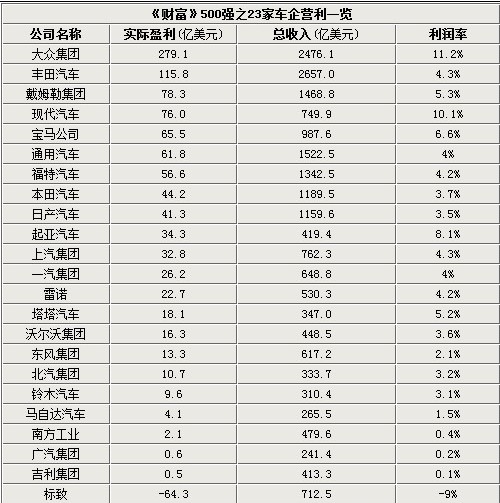 世界500強榜單根據公司營業收入進行排名并公布其利潤收入,不過一個公司實際凈利潤的高低并不直接取決于營利收入的高低,還會受到其他多種因素的影響。例如豐田汽車雖然在總營收方面高于大眾集團,但在實際利潤方面大眾則為豐田的兩倍之多。此外通用汽車雖然擁有第三的營業額,而實際利潤卻低于戴姆勒集團、現代、寶馬等廠商。在23家入選500強車企中不得不提的就是標致汽車,雖然標致獲得了712億美元的營業總額,不過由于各方面因素,實際最終虧損缺達64億美元之多。