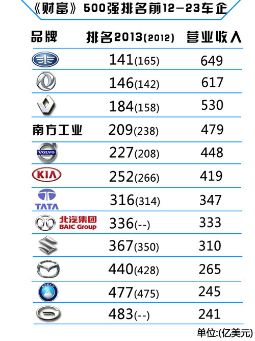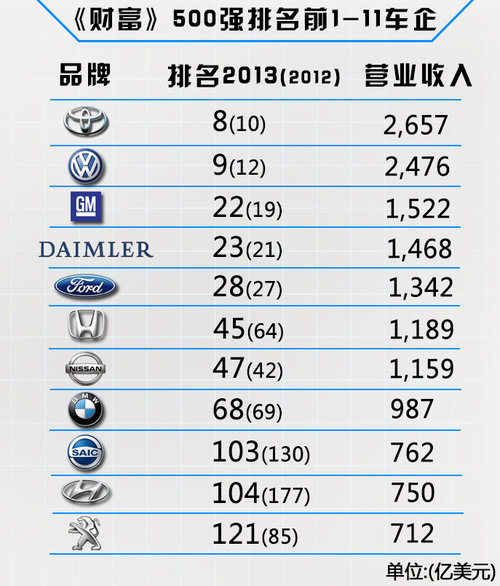 在23家車企中, 日系三大品牌豐田、本田、日產均處于前10名之中,并超過德國豪華品牌寶馬。有業內人士認為:雖然主打中端市場的日系三大品牌在單車售價方面不及豪華品牌寶馬,不過龐大的銷量成為其總營業收入的支撐,使他們營業額更加可觀。而像大眾與通用這樣擁有針對不同市場的多個品牌的汽車集團,獲得的高額營業收入也使他們一直位于世界500強榜單的前列。