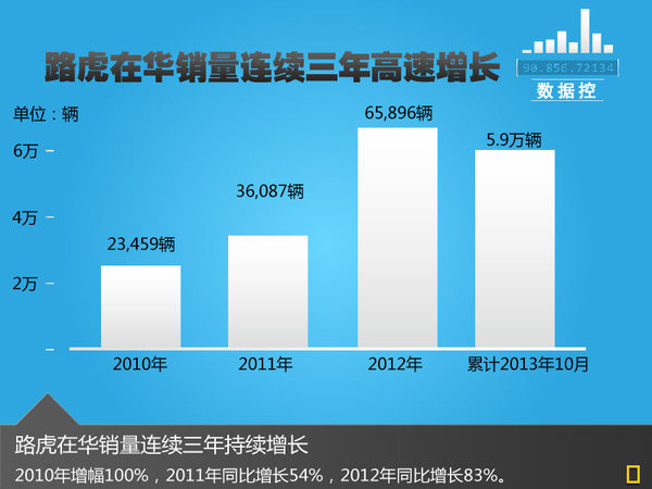 SUV市場的持續升溫和消費者對于豪華品牌認知度的不斷提高,使得豪華SUV市場更是備受關注。路虎品牌便依托旗下攬勝、神行者2以及極光在市場中的強勁表現,連續三年保持高增長態勢。其中2010年路虎在華銷售23,459臺,同比增長近100%;2011年共銷售36,087臺,同比增長54%; 去年銷量更是達到了65,896臺,同比增長83%,其中2013年前10個月銷量已占據2012全年近90%的份額。