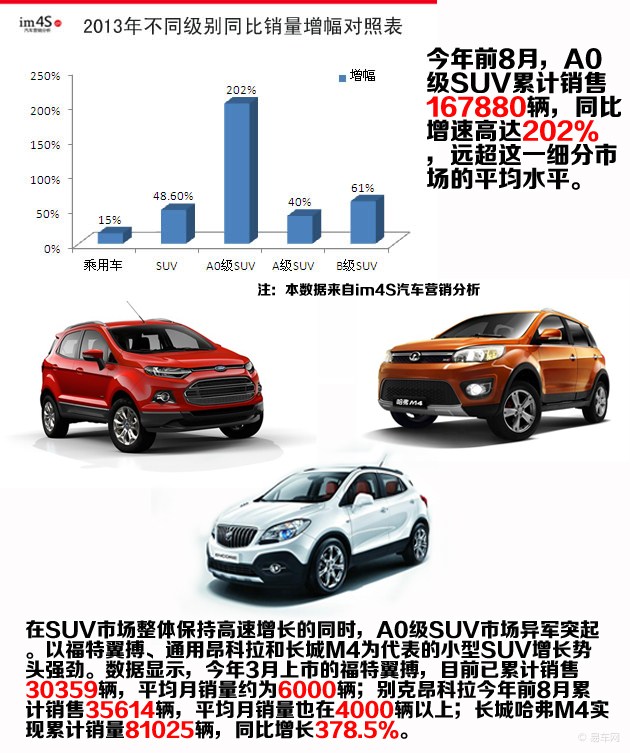 今年前8月,A0級SUV同比增速高達202%,遠遠超過其他SUV車型。翼搏、昂科拉和M4這三款A0級SUV的車型代表更是表現強勁。
